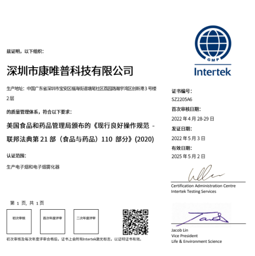 祝賀深圳市康唯普科技有限公司2022年一次性成功通過(guò)電子煙GMP 110認(rèn)證