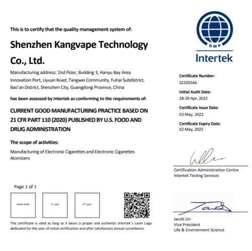 本文來(lái)源:驗(yàn)廠之家網(wǎng) - 祝賀深圳市康唯普科技有限公司2022年一次性成功通過(guò)電子煙GMP 110認(rèn)證