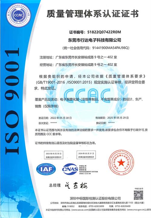 祝賀東莞市行達電子科技有限公司2022年一次性成功通過ISO9001認證