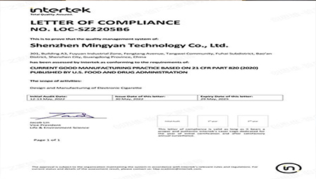 祝賀深圳市銘煙科技有限公司2022年一次性成功通過電子霧化GMP 820認證