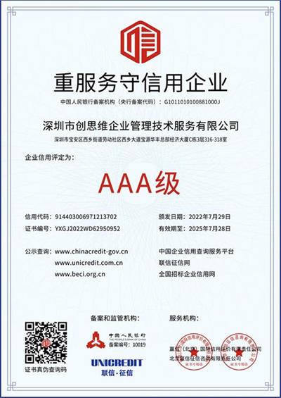 祝賀深圳市創思維企業管理技術服務有限公司榮獲“重服務守信用企業”榮譽證書