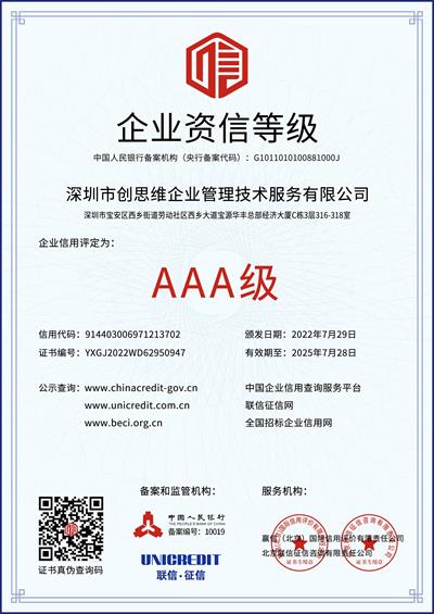 自成立以來,企業信用與企業發展一直都是一脈相承,深圳市創思維企業管理技術服務有限公司一直規范自身經營,重視信用建設,贏得了業界的高度贊譽。深圳市創思維企業管理技術服務有限公司獲得“3A級企業資信等級”榮譽證書,再一次證明了社會對深圳市創思維企業管理技術服務有限公司的企業信用與品牌知名度的認可與肯定。標志著公司的軟實力和信譽度的提升,更是對公司誠信經營行為的肯定。重視企業信用,是企業自覺接受社會監督,勇于承擔責任、義務的承諾,是一個企業的立足之本。