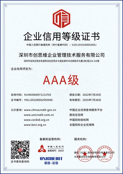 多年來深圳市創(chuàng)思維企業(yè)管理技術(shù)服務(wù)有限公司始終秉承“信譽(yù)第一、服務(wù)至上”的企業(yè)宗旨,以打造“高信用、高資信、高品牌”作為企業(yè)發(fā)展戰(zhàn)略目標(biāo),堅持“質(zhì)量第一、客戶至上”的經(jīng)營理念,不斷全面提升企業(yè)資信和服務(wù)質(zhì)量,繼續(xù)堅守匠心發(fā)展,積極推行科學(xué)嚴(yán)謹(jǐn)?shù)馁|(zhì)量管理體系,踐行企業(yè)擔(dān)當(dāng),為顧客創(chuàng)造最大價值。