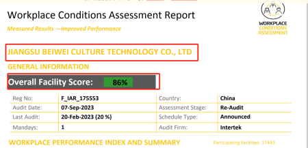 在創思維驗廠之家網老師專業技術、一對一跟進耐心輔導及公司全體員工配合下,一次性順利通過ITS-WCA驗廠,為將來公司發展奠定良好的發展基礎,既開拓了市場同時也增加了消費者對公司的信賴,在這里再次祝賀江蘇百威文化科技有限公司2023年一次性成功通過ITS-WCA驗廠,同時也期待未來再次與創思維驗廠之家網合作!