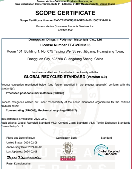 祝賀東莞鼎智高分子材料有限公司2024年一次性成功通過GRS認證