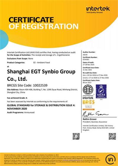 本文來源:驗廠之家網 - 祝賀上海麥角硫因科技有限公司2025年一次性成功通過BRC認證并取得A級證書