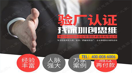 如果企業想做驗廠輔導,不妨考慮一下創思維驗廠之家,創思維驗廠之家是專業的驗廠輔導公司,已經為全國各地上萬家企業服務過,在全國多處設有辦事處,會就近安排老師進場輔導,我們的輔導原則是幫助企業通過驗廠,深圳市創思維是一家正規專業的驗廠咨詢、驗廠輔導、認證輔導公司,一切以合同條款為準,不亂收費,并盡可能為企業節約成本,通過后付款!