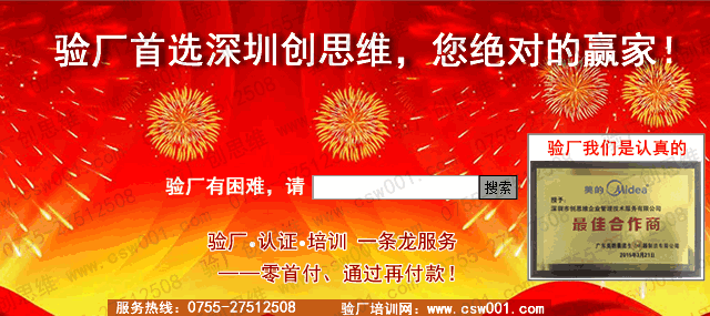 如果企業想做驗廠輔導,不妨考慮一下深圳市創思維,創思維驗廠之家網是專業的驗廠輔導公司,已經為全國各地上萬家企業服務過,在全國多處設有辦事處,會就近安排老師進場輔導,我們的輔導原則是幫助企業通過驗廠,深圳市創思維是一家正規專業的驗廠咨詢、驗廠輔導、認證輔導公司,一切以合同條款為準,不亂收費,并盡可能為企業節約成本。驗廠零首付,通過后付款,驗廠必過,驗廠無憂!