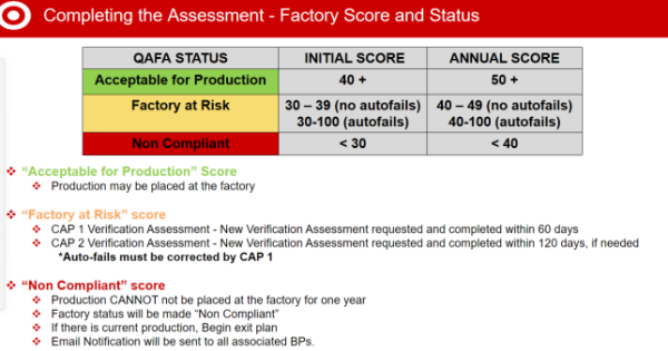 對于新工廠和年度審核的工廠,Target質量驗廠準則采用計分制,得分關鍵在于能否通過關鍵指標,但能不能需重新查驗關鍵在于存不存在“自動常見故障”,即零容忍。對于綠燈(允許生產制造),年度審核工廠分數不能低于40分;對于黃燈(危險工廠),年度審核工廠分數需在30-39分或40-49分之間;對于紅燈(不符合),年度審核工廠分數需在30分以下或40分以下。如果總體目標質量驗廠結果為不合格,工廠需要提交CAP和現場跟蹤,企業只會在改進驗收合格后才能進行生產制造。